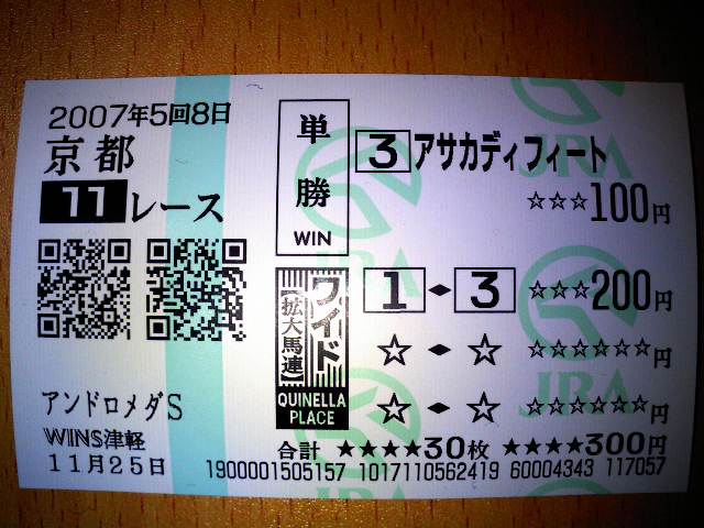 ○ドリームパスポート…走れる仕上がり。後は息が持つかだけ ▲ポップロック…マズマズ順調 注ヴィクトリー…落ち着きあり不気味 ☆ウオッカ…想像よりはずっとマシ 外国馬は良い馬ばかりで、絞れないし手が回りません ~回顧@21:00~ ガックリ ![]() ![]() ![]() 買わなきゃ来る×2アドマイヤムーン・・・ハイ、甘く見た私めが悪うございました ![]() 岩田騎手とは本当に馬券の相性が・・・いえ、何でもございません 来るときに買えない私めが(以下略・・・ま、上位3頭の差はコース取りでしょうね。サムソンは馬場の悪いインを回避&安全策で外を廻した・・・それでも勝てると踏んでのことでしょうが、結果的にはそれがアダとなってしまいました。 東京は内の馬場が荒れても、雨でも降らない限りそれなりに伸びるんですよね。安田記念もそんな感じでしたし。ただ、荒れた馬場を苦にしない馬なら、という条件は付きますが。 アドマイヤムーンの走法にピッタリの馬場コンディションになっていた、ということでしょう。そして馬を信じて、勇気を持って終始インを廻った岩田騎手にも拍手・・・したくないなあ、心情的に(苦笑) あとあと、チョウサンも結構強かったですね。馬体構造的に2400は長いんですけども。来年の安田記念◎候補! 今週は重賞の成績は一息でしたが、遊びで買ったアンドロメダSで救われました。 ありがとうアサカ爺ちゃん。来年もよろしく ~♪単勝③ 3330円 ワイド①-③ 610円 購入 300円 払い戻し 4550円